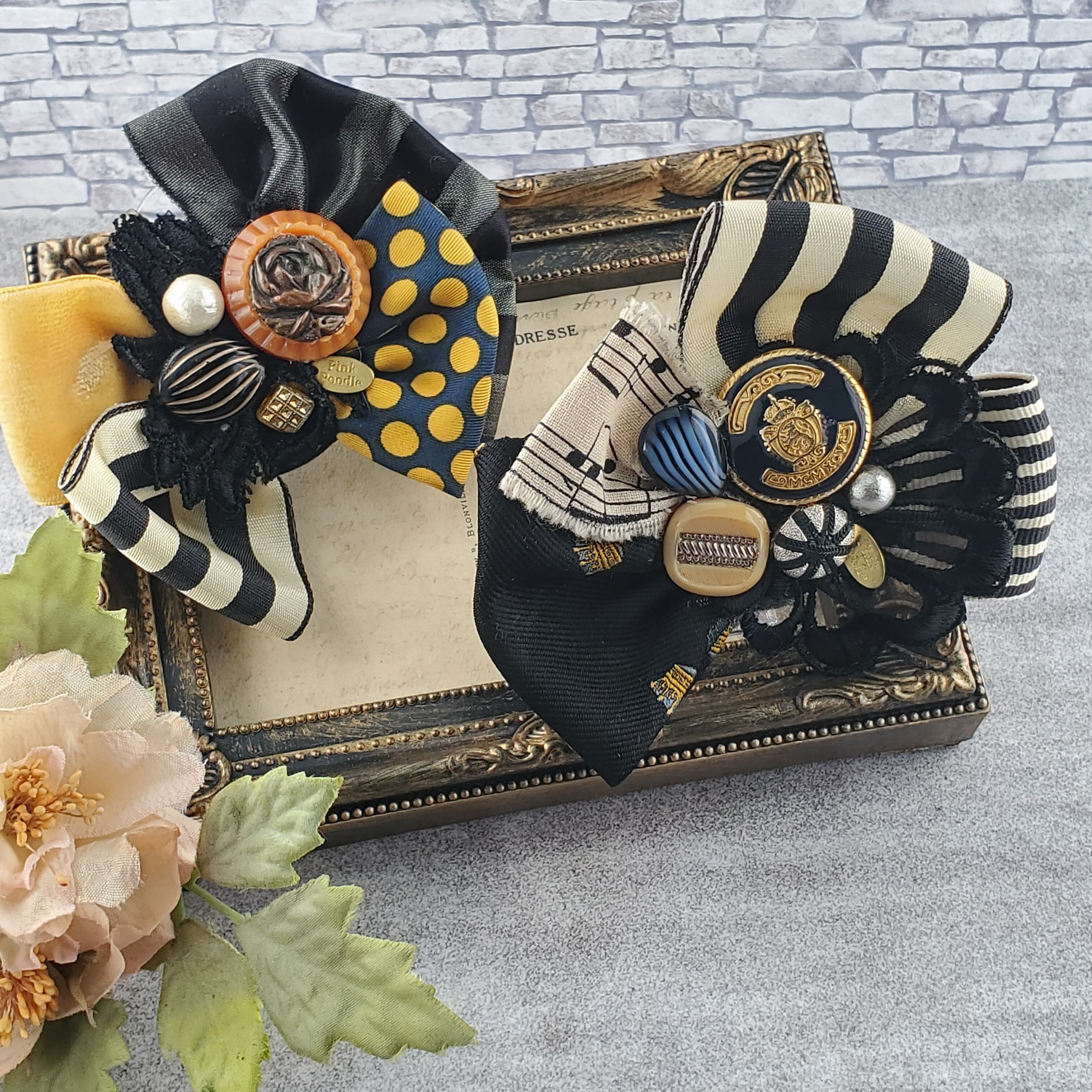 パリの蚤の市や、アメリカのアンティークモールで見つけたヴィンテージパーツやリボン、ボタンなどをコラージュしたコサージュ。